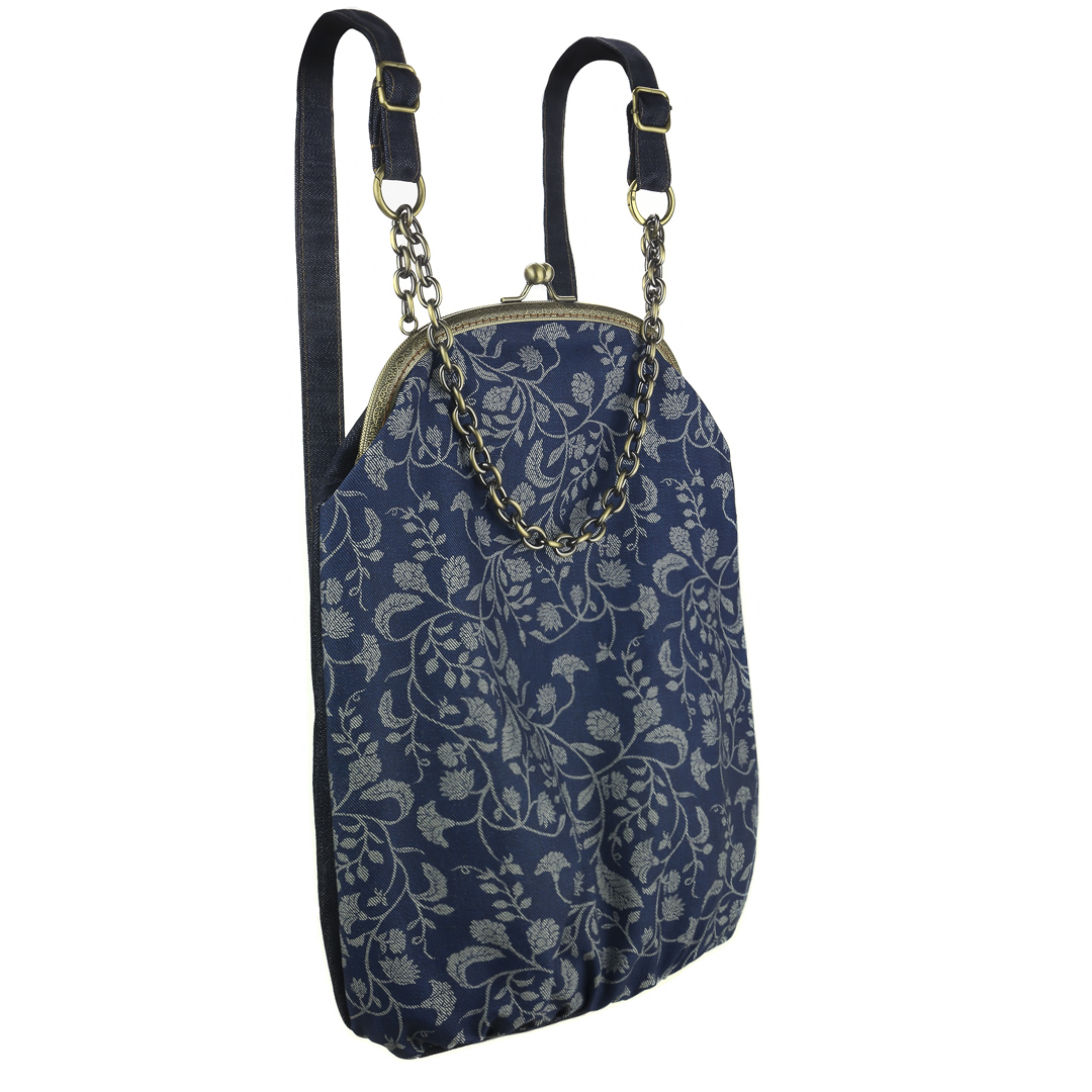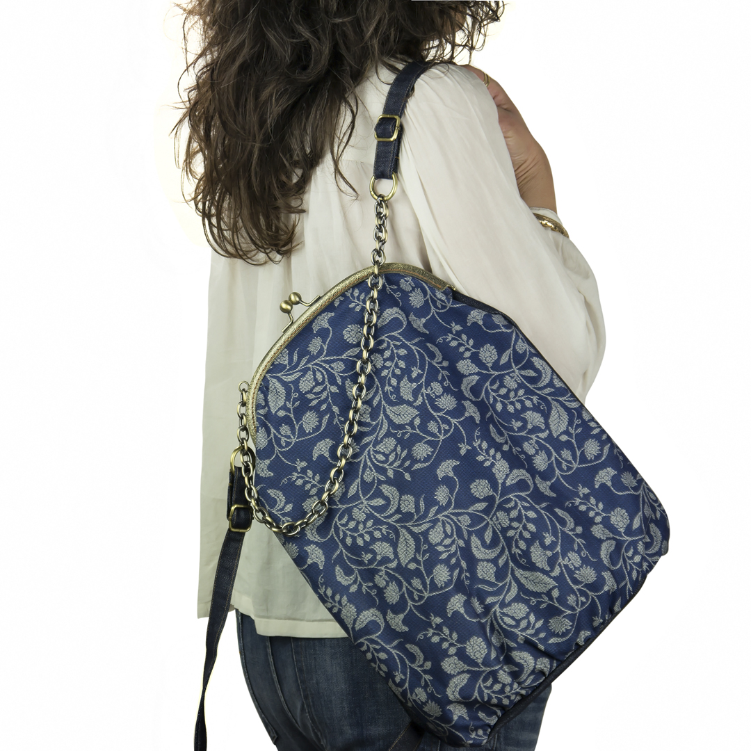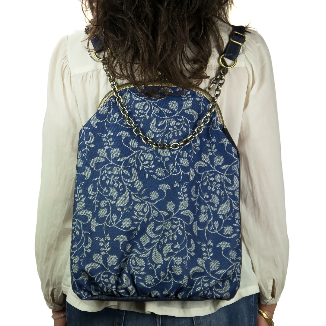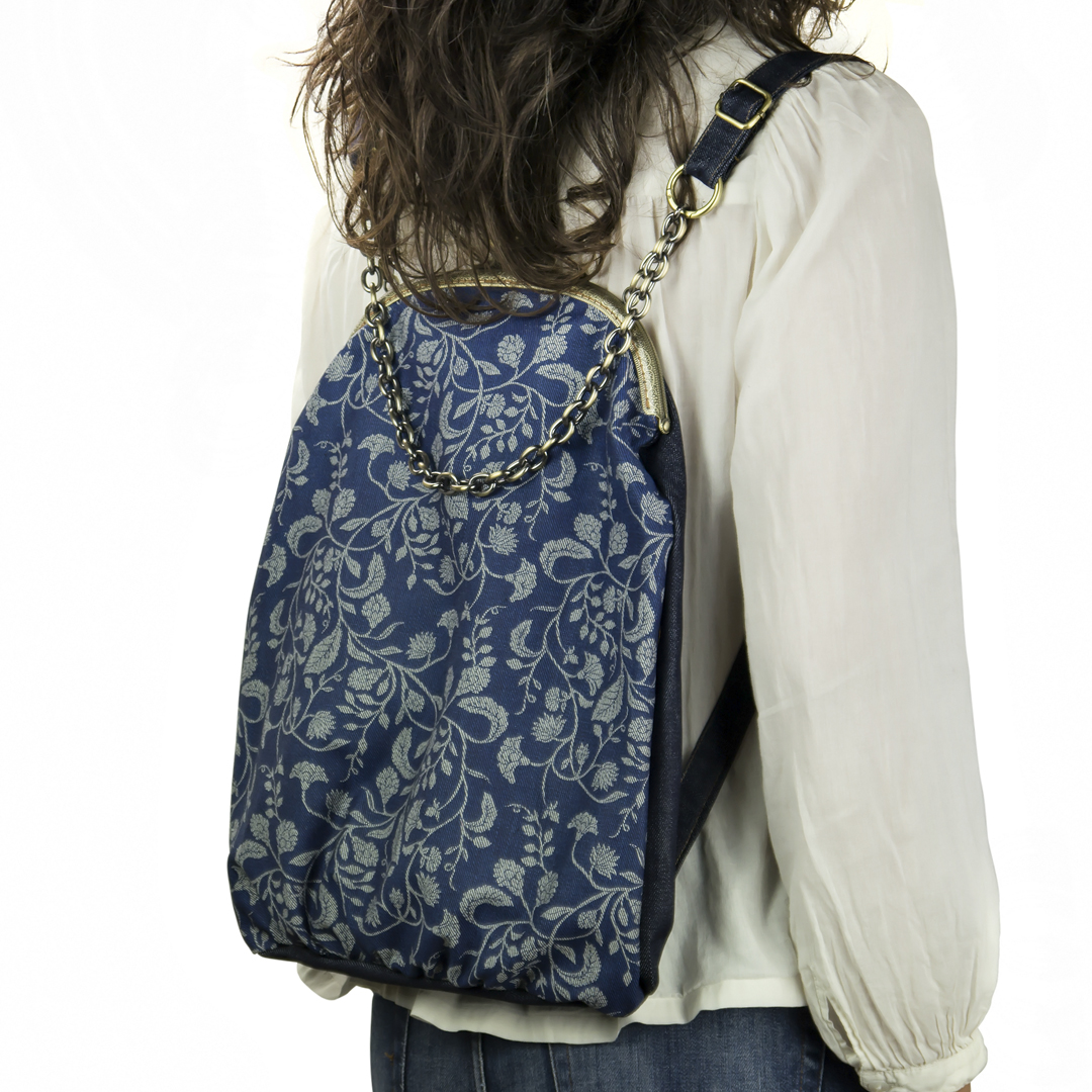Το μπροστινό μέρος είναι τυπωμένο με οικολογικά μελάνια νερού* και το πίσω, όπως και οι ρυθμιζόμενοι ιμάντες, είναι βαμβάκι. Η εσωτερική φόδρα είναι εφοδιασμένη με μια τσέπη με φερμουάρ. Στο πίσω μέρος το σακίδιο φέρει μια “κρυφή” εξωτερική τσέπη. Οι ιμάντες εκτός από το μήκος ρυθμίζονται με έναν κρίκο που ανοίγει, ως προς τη θέση που θέλουμε να συνδέονται με την αλυσίδα – χερούλι. Το κλείστρο είναι μεταλλικό ραμμένο στο χέρι.