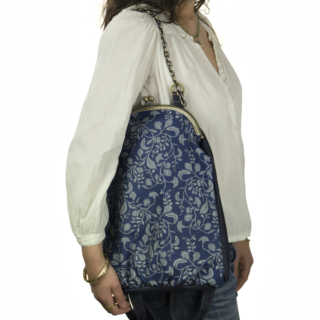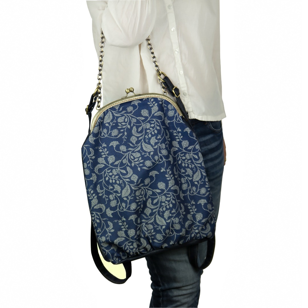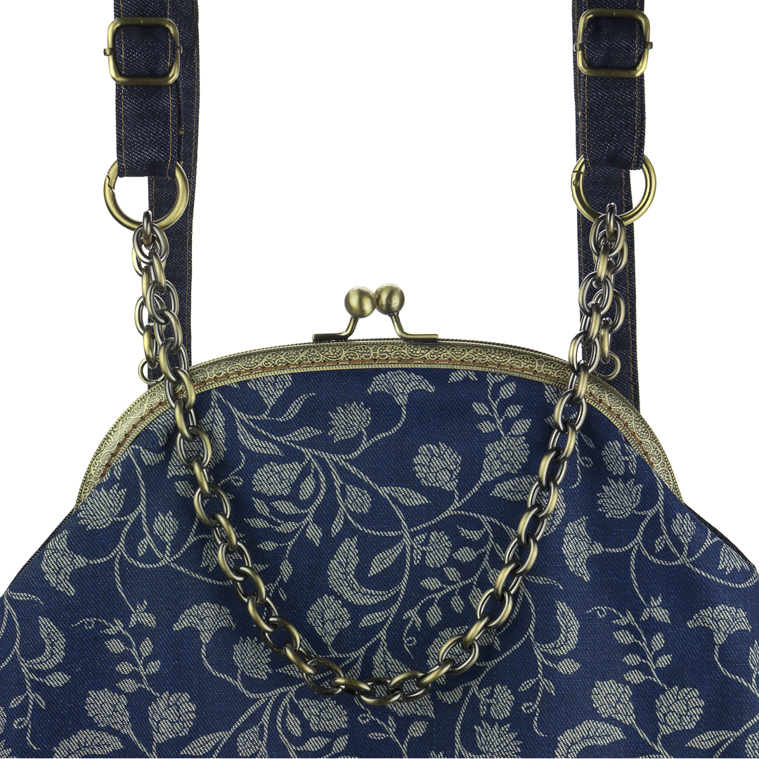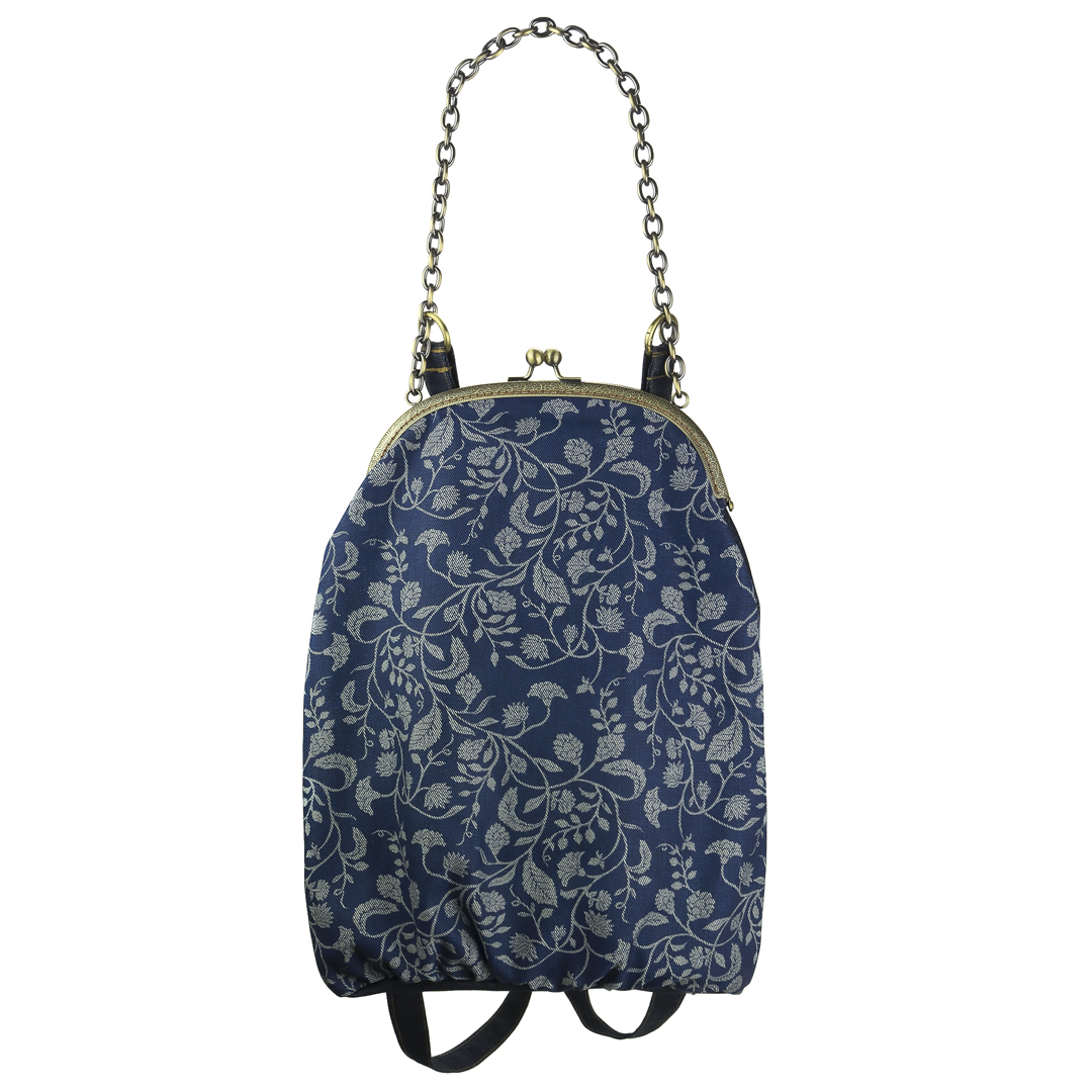 Το μπροστινό μέρος είναι τυπωμένο με οικολογικά μελάνια νερού* και το πίσω, όπως και οι ρυθμιζόμενοι ιμάντες, είναι βαμβάκι. Η εσωτερική φόδρα είναι εφοδιασμένη με μια τσέπη με φερμουάρ. Στο πίσω μέρος το σακίδιο φέρει μια “κρυφή” εξωτερική τσέπη. Οι ιμάντες εκτός από το μήκος ρυθμίζονται με έναν κρίκο που ανοίγει, ως προς τη θέση που θέλουμε να συνδέονται με την αλυσίδα – χερούλι. Το κλείστρο είναι μεταλλικό ραμμένο στο χέρι.