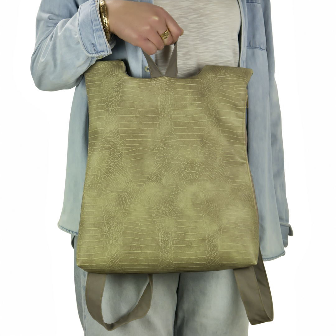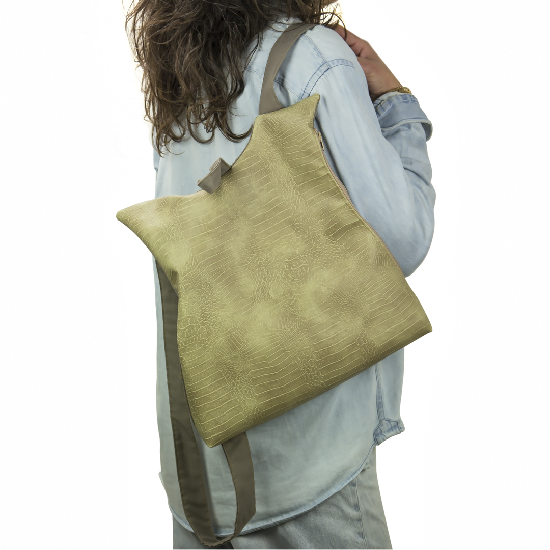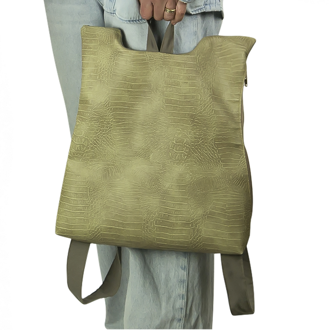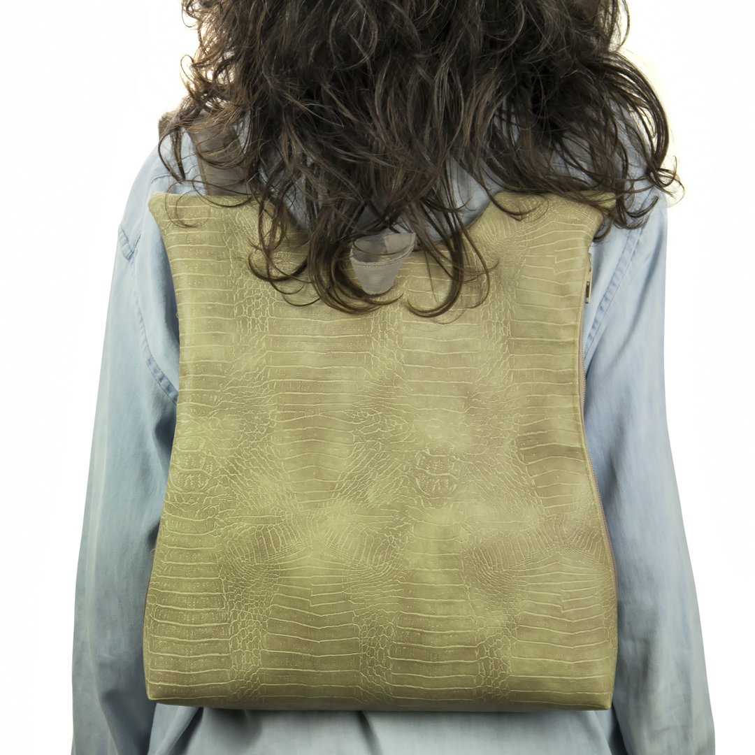 Το μπροστινό μέρος είναι δερματίνη και το πίσω μέρος, όπως και ιμάντες, είναι βαμβάκι. Ανοίγει απο το πλάι με ενα φερμουαρ 30 εκατοστών. Η εσωτερική φόδρα είναι εφοδιασμένη με μια τσέπη με φερμουάρ. Στο πίσω μέρος το σακίδιο φέρει μια “κρυφή” εξωτερική τσέπη.